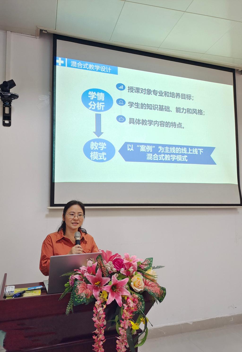 病理生理学教研室李彬彬教授以“线上线下混合式教学设计”为题,结合教学实践,从学情分析、教学模式的选择、教学目标的确定、教学设计与实施、课程思政的设计和融入以及课程考核与评价等方面阐述了混合式教学设计的基本思路,并以临床专业《肾功能不全》章节为例,分享了如何实现“以目标为导向”、“以学生为中心”的教学目的,与参会教师对混合式教学中存在的问题作深入探讨及经验交流。