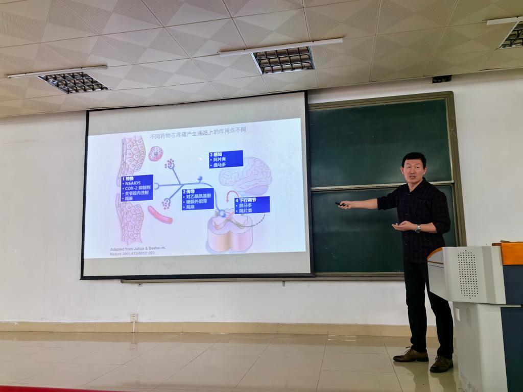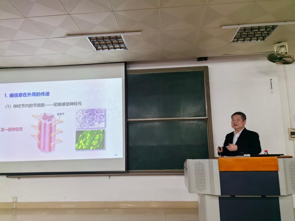 中国解剖学会理事长、空军军医大学李云庆教授和广东省生理学会理事长、中山大学中山医学院信文君教授受邀分别以痛信息传递和调控、疼痛和镇痛药为题,向我校湛江校区2021级麻醉专业同学介绍了麻醉与疼痛领域的相关知识和科学前沿成果。