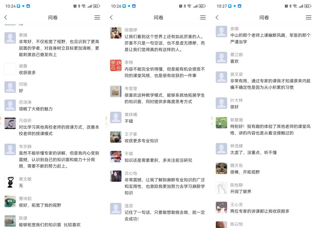 此次与校外专家面对面的机会让麻醉专业同学们兴奋不已。大家纷纷表示,通过此次交流不仅从专家教授们简练有趣的话语中感受到学习麻醉学的乐趣,还被他们对麻醉医学孜孜以求、精进不休的精神所感动,更加坚定了对麻醉工作的向往和追求。